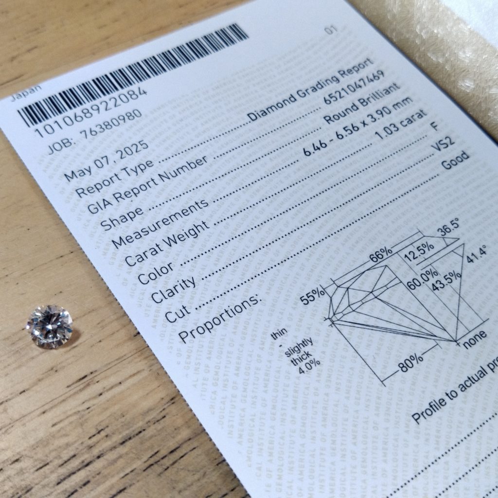 ダイヤモンド:1.03ct、Fカラー、VS2、Good cut