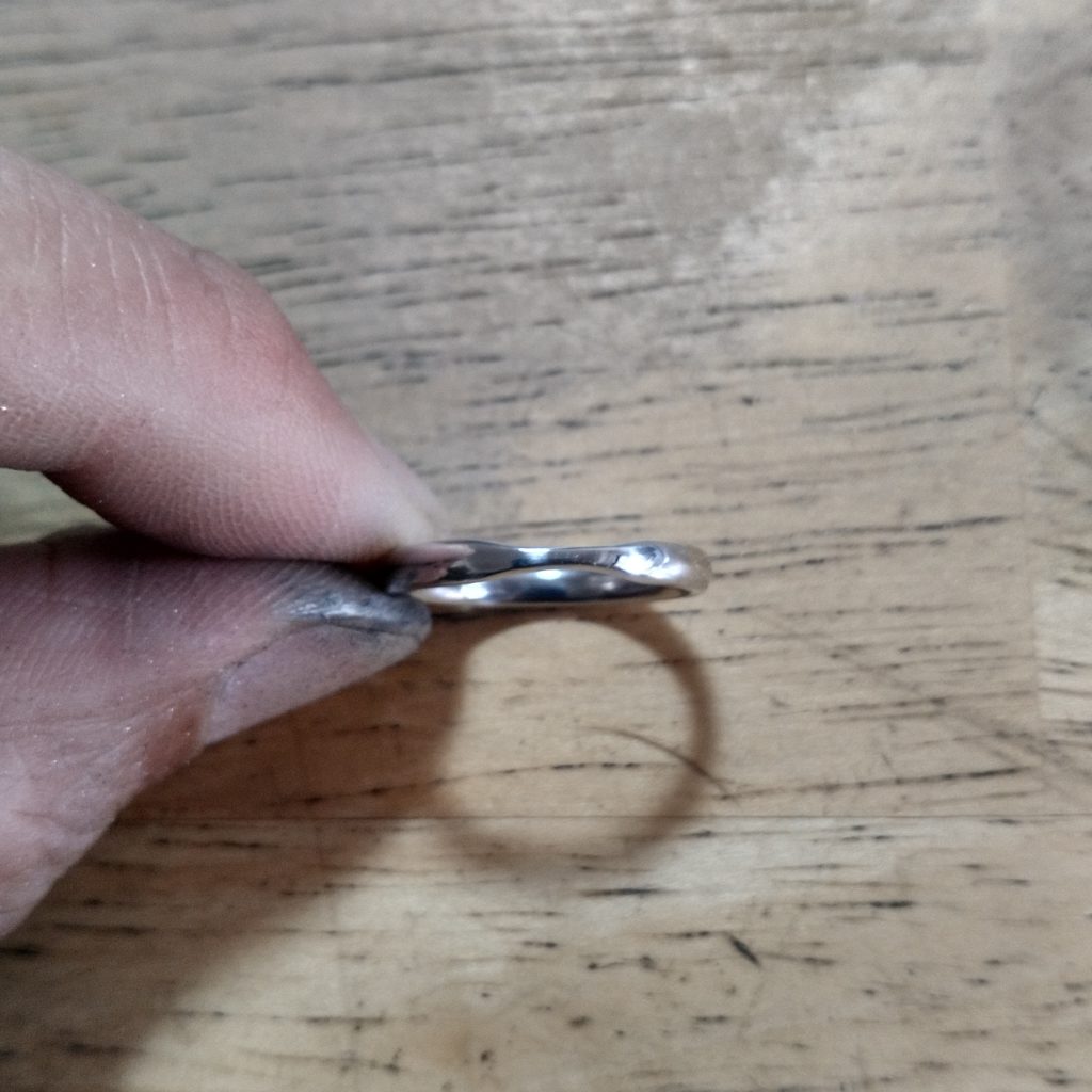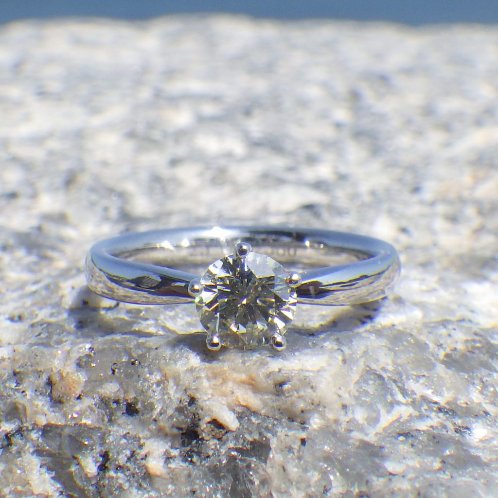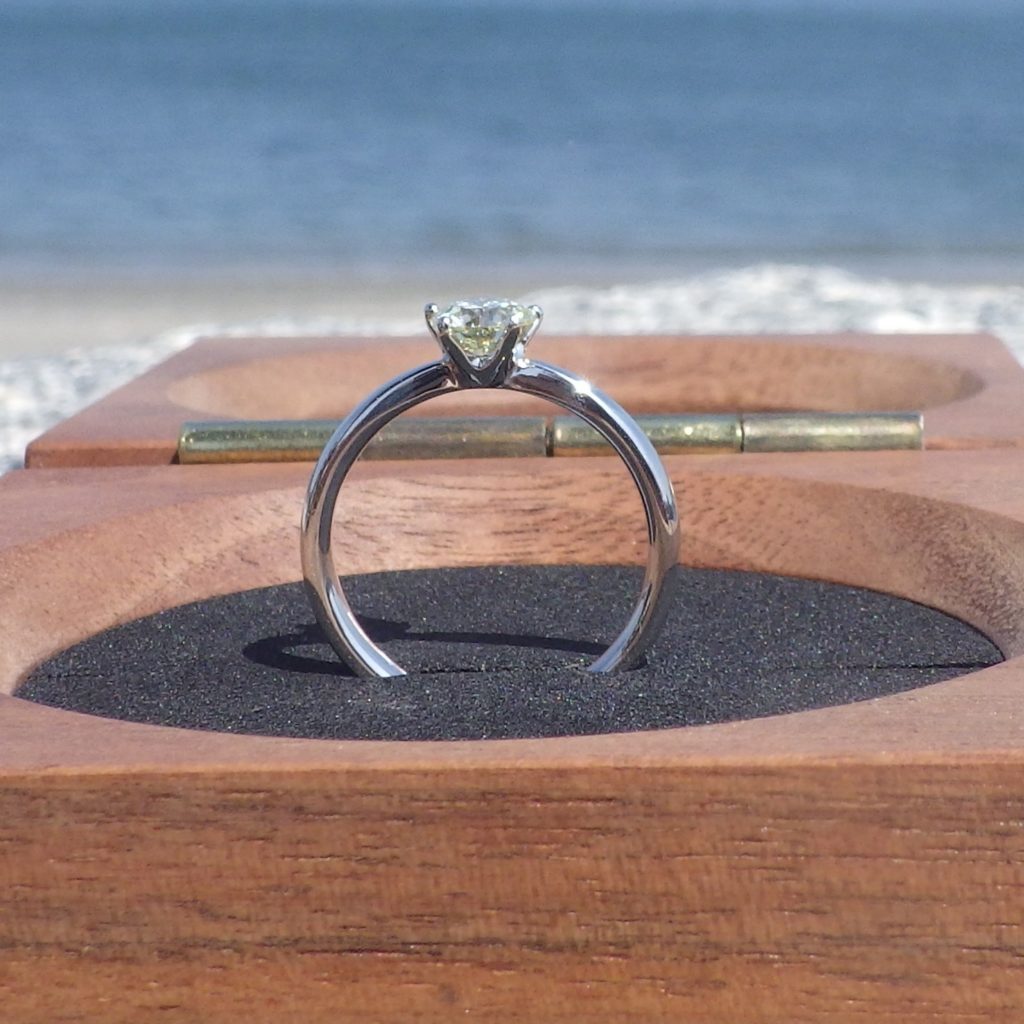 ごくシンプルなデザインではありながらも、正面中央の石座にかけて幅を絞り込んでゆく曲線の美しさ、そして5本爪でダイヤモンドをホールドしているところが、こだわりポイントです。