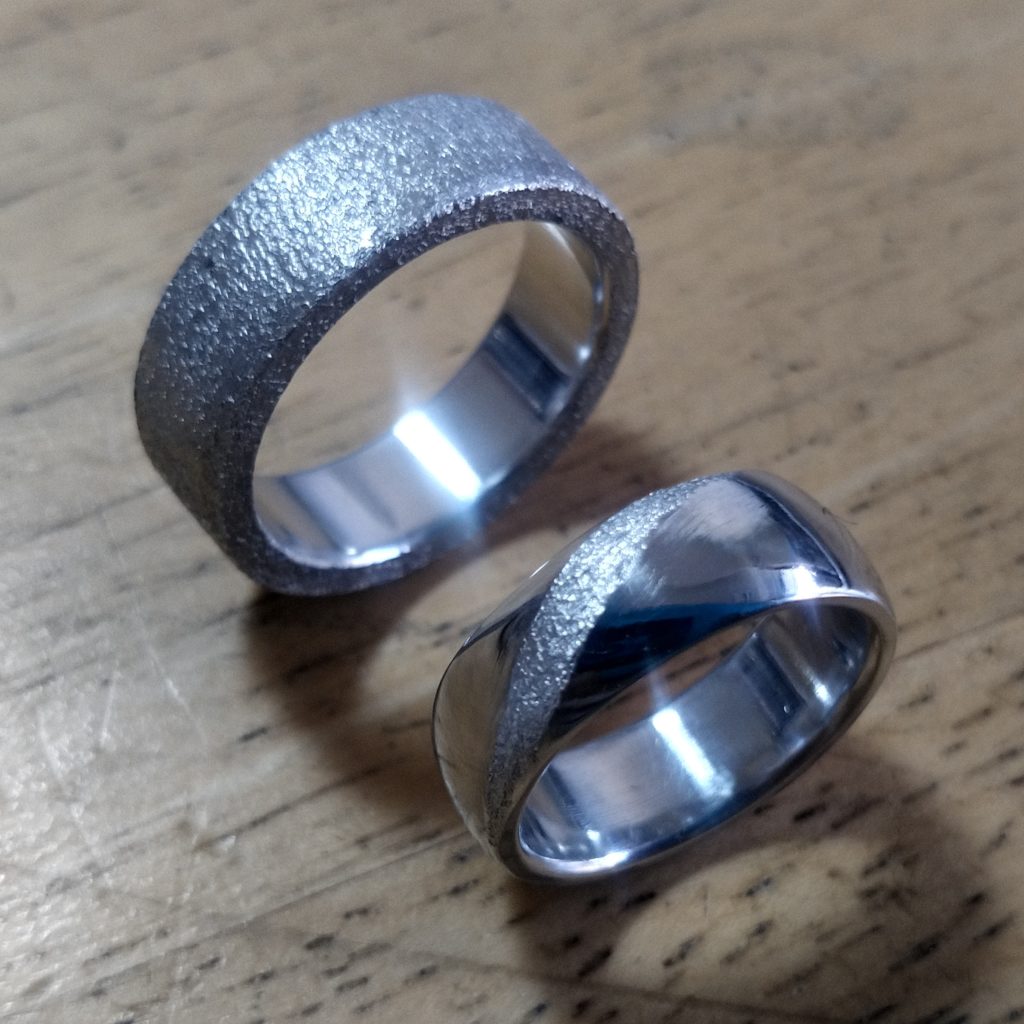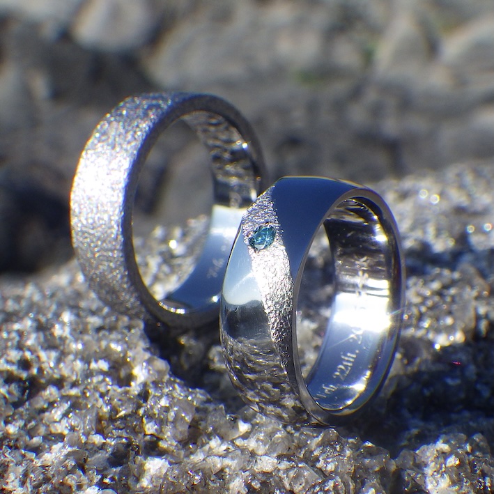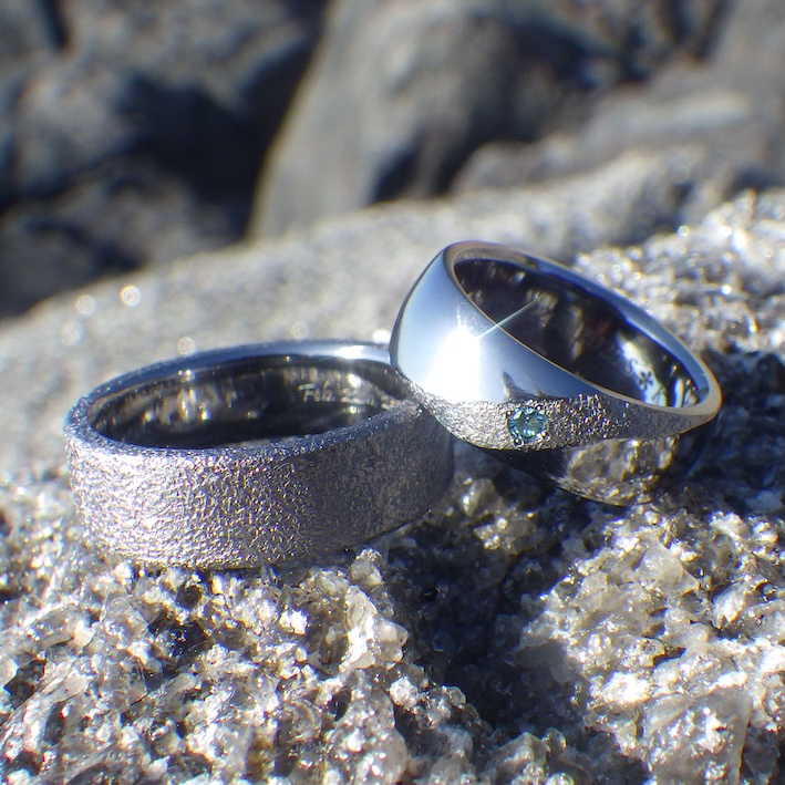 お作りさせていただいたデザインは、タンタルの黒くて渋い雰囲気を強調する「荒らし仕上げ」をお揃いにして、男性リングはシンプルな平打ち形状に全面荒らし仕上げ。女性リングはナナメラインと丸みを加えつつ、ブルーダイヤモンドを1点添えました。