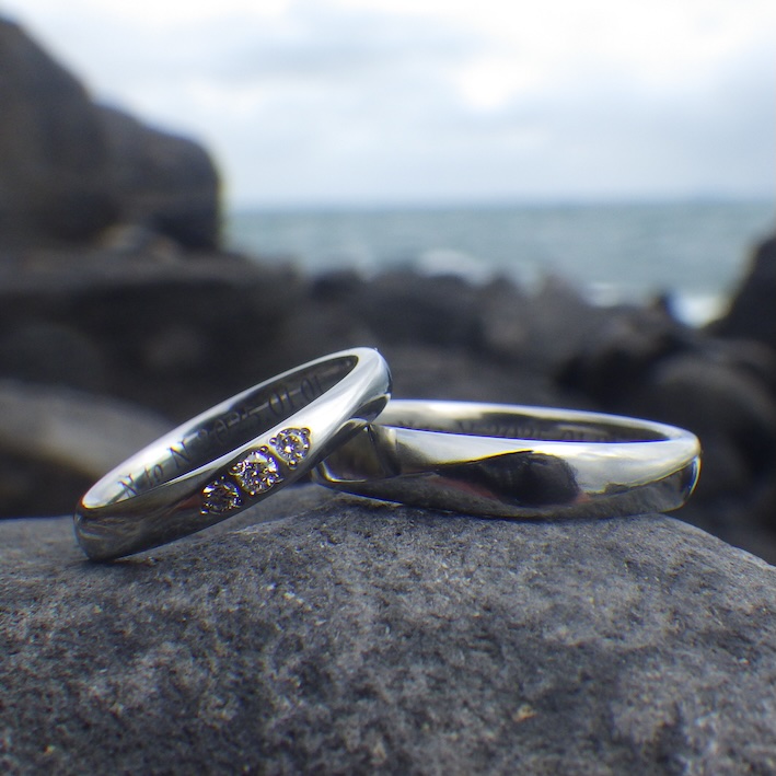 そして、女性リングの正面には、ダイヤモンドを端正に石留めして、上品な輝きを加えています。