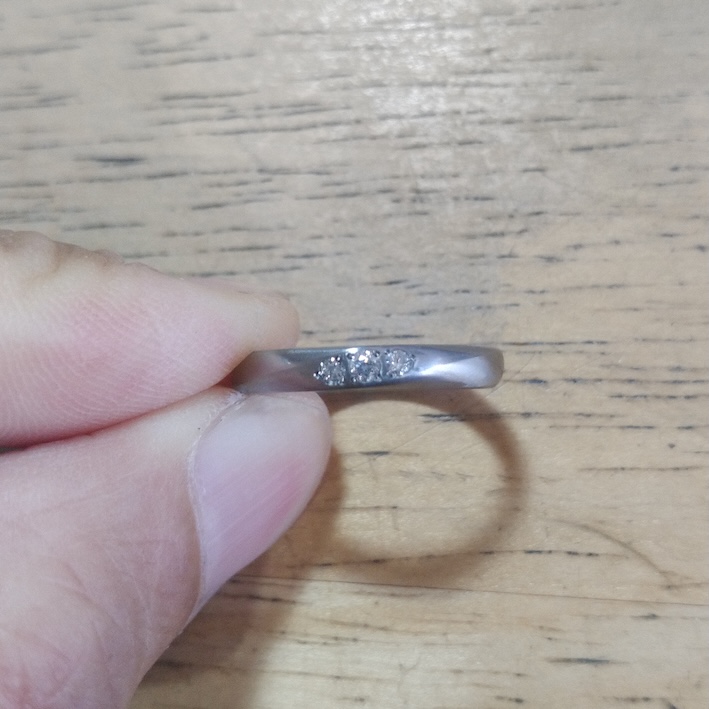 女性リングの外周正面に、ダイヤモンド(φ1.6mm、φ1.8mm、φ1.6mm)を石留め