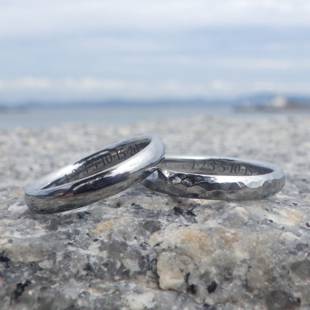 お作りさせていただいたデザインは、丸みのある形をベースにして、ゆるやかなウェーブ(ウェーブ高低差0.4mm)、そして男性リングには鎚目仕上げを施して、仕上げさせていただいております。