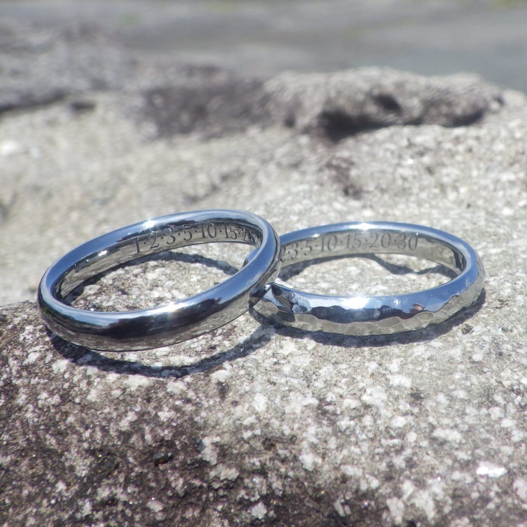 というお問い合わせと、お電話をいただきまして、お打ち合わせにお越しになり、お作りさせていただいたハフニウムの結婚指輪です。