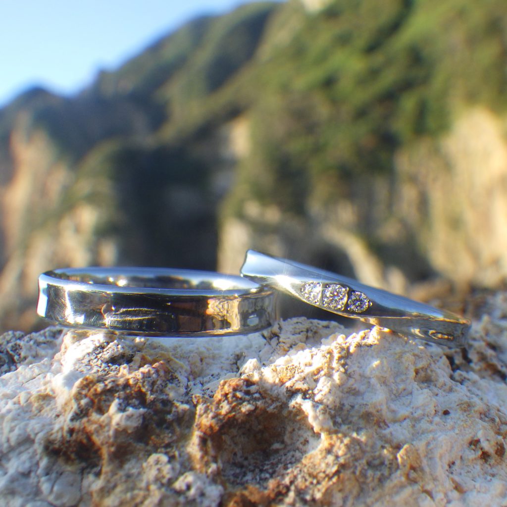 なだらかな凹面とネジリを組み合わせ、ネジリの正面に3石を留めた女性リングと、なだらかな凹面だけでシンプルに仕上げた男性リング。共通点とこだわりの部分が両立したペアリングに仕上がっています。