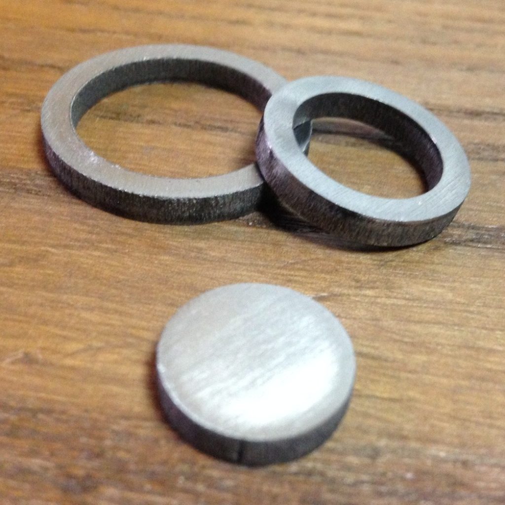 そして、男性リング、そして女性リングを切り抜いた残りの円筒形の内側の端材は、削り出すとちょうど内径10mm(=マイナス8号)ぐらいになるので、ベビーリングに最適の大きさです。